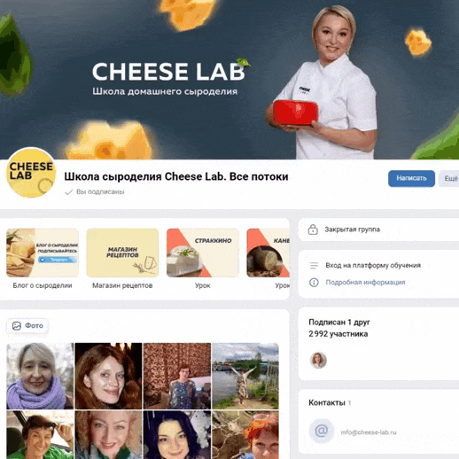 Вы на связи с однокурсниками Каждый ученик получает доступ в закрытое сообщество. В нем есть и новички и опытные сыроделы. Общайтесь с единомышленниками, обменивайтесь наработками и опытом, делитесь полезными ссылками, просите совета, помогайте сами и вдохновляйте друг друга результатами!